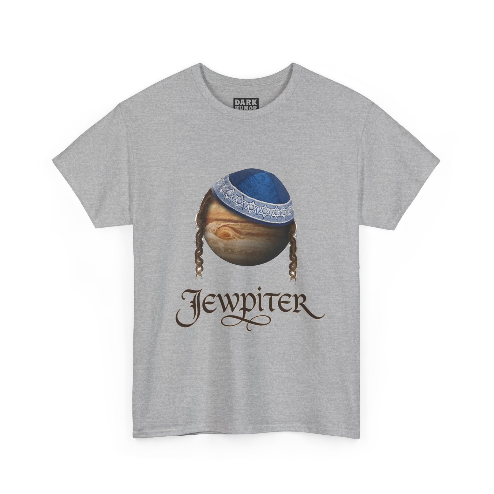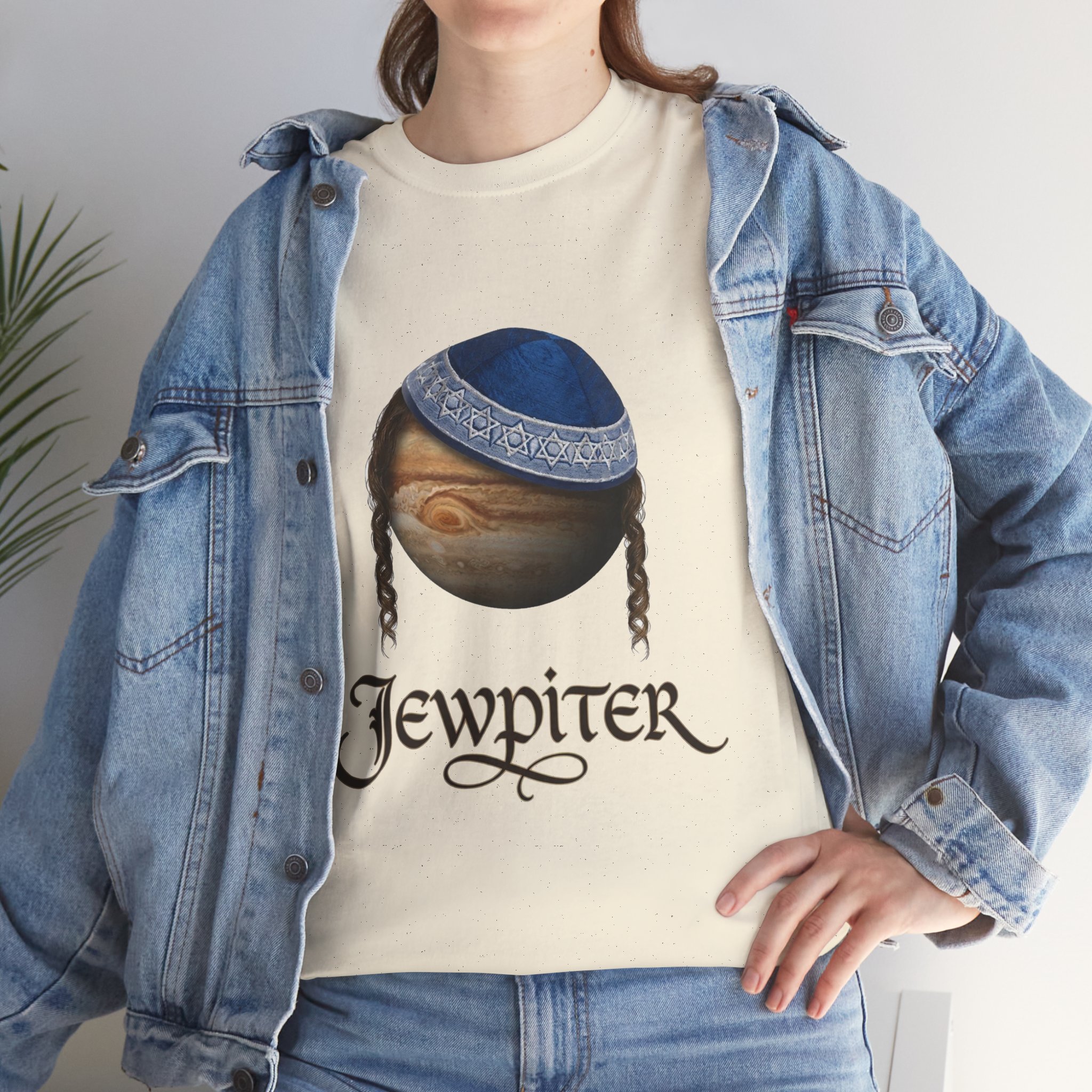 A soft, breathable cotton tee that blends playful cosmic art with cultural charm. The front features a detailed, painterly planet motif wearing a blue kippah and sidelocks, paired with ornate script below. It reads like a lighthearted, clever nod to identity and imagination — easy to wear around town, at community gatherings, or whenever you want to spark a conversation. The classic crew neckline and relaxed fit make it comfortable for long days, while the high-quality print stays crisp and clear wash after wash. Wear it with jeans, under a jacket, or layered for cooler evenings; it’s a casual statement piece that feels personal and thoughtful.